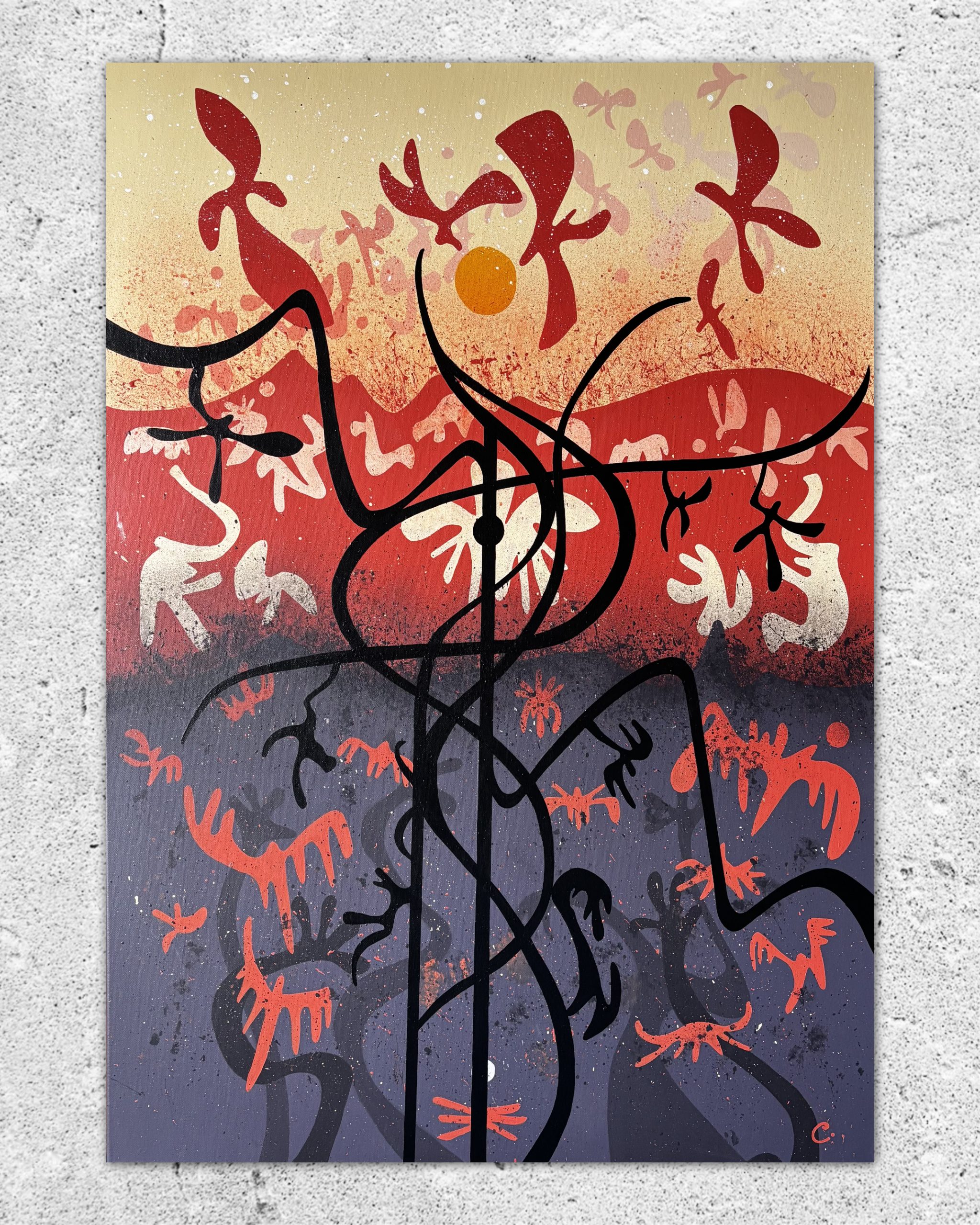 This work explores the intersection of ancient memory, nature, and contemporary vision, using a figurative-abstract, biomorphic language called Neo-Rupestre — coined to describe a modern evolution of cave art and sacred symbolism.